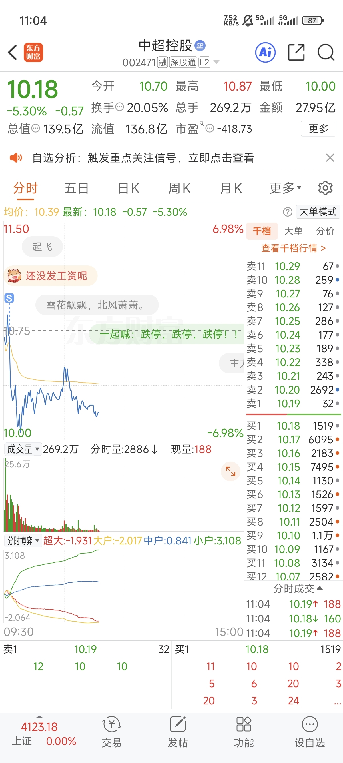 $中超控股(SZ002471)$ 早上感觉不对 10.76全清了 年尾清仓过年