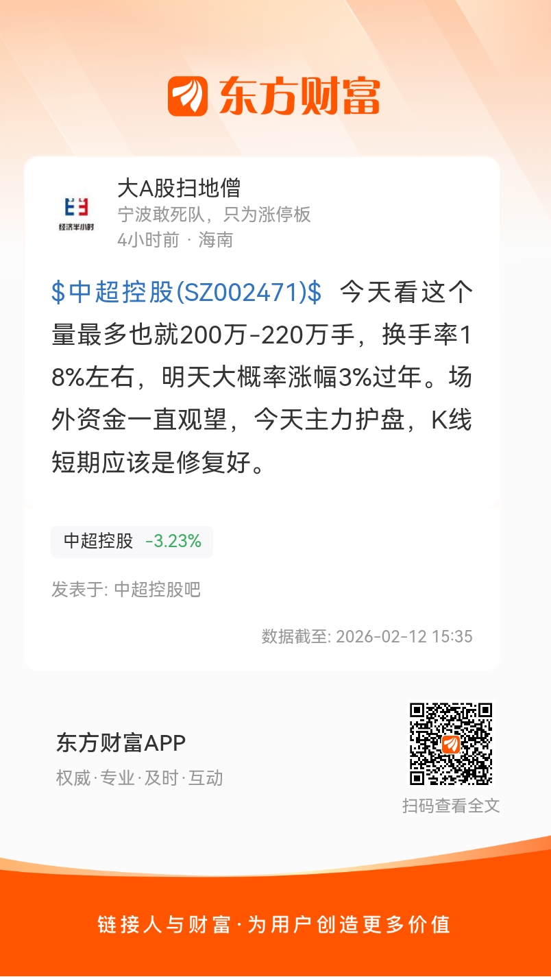 $中超控股(SZ002471)$ 今天看这个量最多也就200万-220万手,换手率18%左右,明天大概率涨幅3%过年。场外资金一直观望,今天主力护盘,K线短期应该是修复好。
