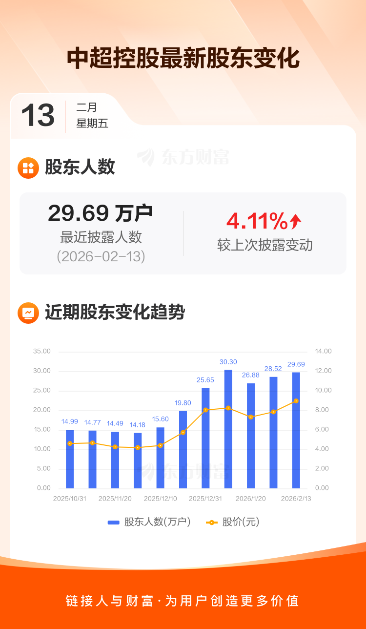 中超控股:截至2月13日最新股东户数29.69万户,较上期增加4.11%