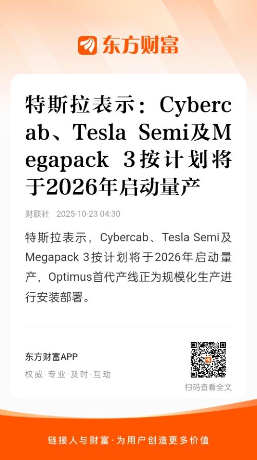 特斯拉表示,Cybercab、Tesla Semi及Megapack 3按计划将于2026年启动量产,Optimus首代产线正为规模化生产进行安装部署。
