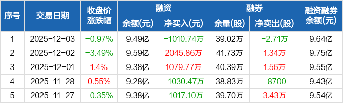 双环传动:融资净偿还1010.74万元,融资余额9.49亿元(12-03)
