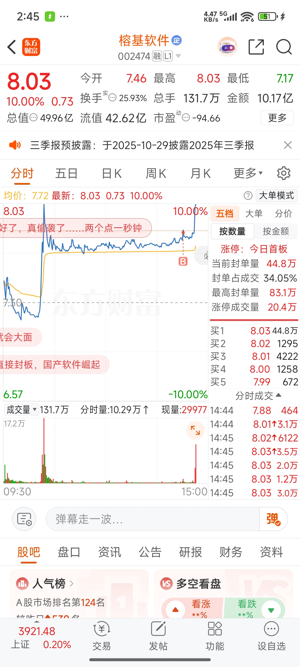 $榕基软件(SZ002474)$ 观察一天资金一直在进,主力尾盘拉板是一笔偷袭拉了两个点,尾盘是小千砸,边砸边撤,最后一万手是散户合力跑了,有回封的能力但不封,竞价稳住了,还是软件发酵程度不够明天得观察他和格尔还有大屁股