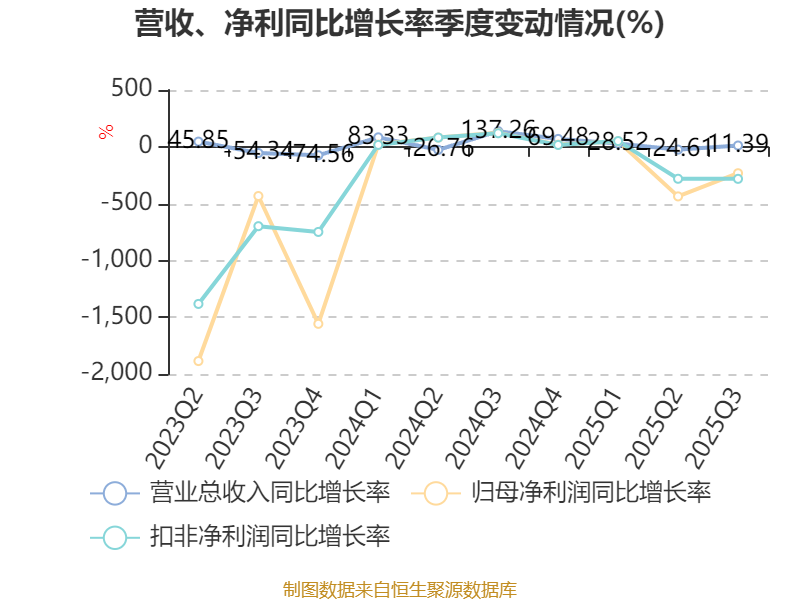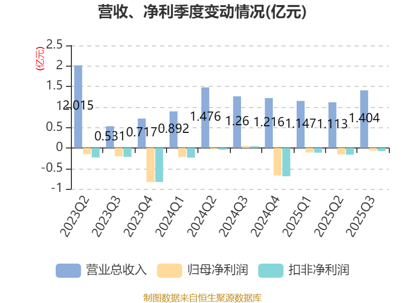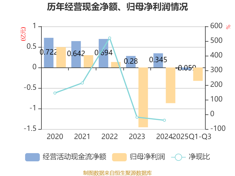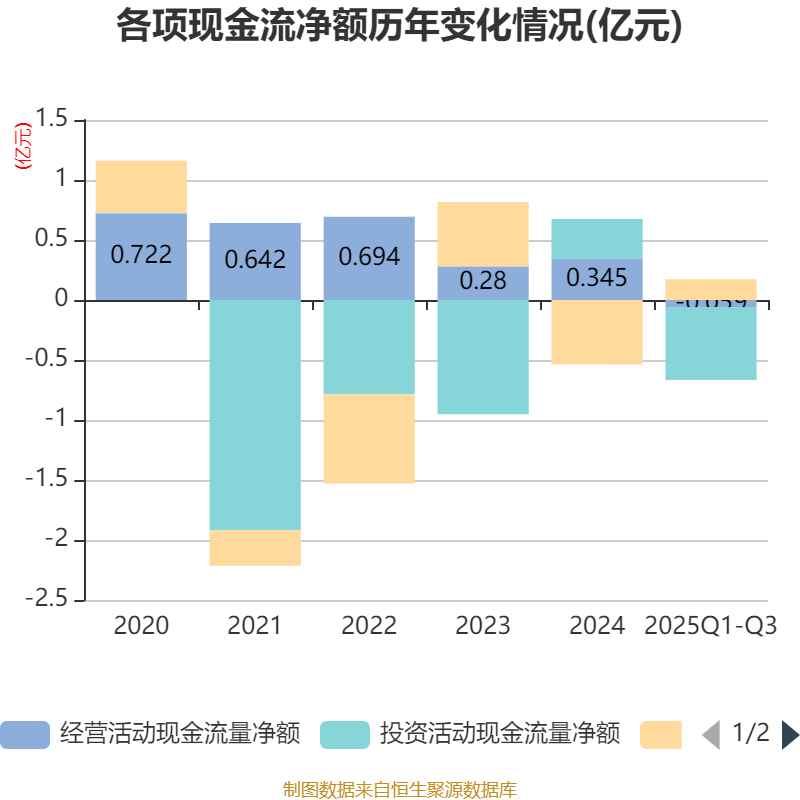 2025年前三季度,公司经营活动现金流净额为-592.43万元,同比减少1667.4万元;筹资活动现金流净额1730.79万元,同比增加6996.59万元;投资活动现金流净额-6066.17万元,上年同期为987.19万元。