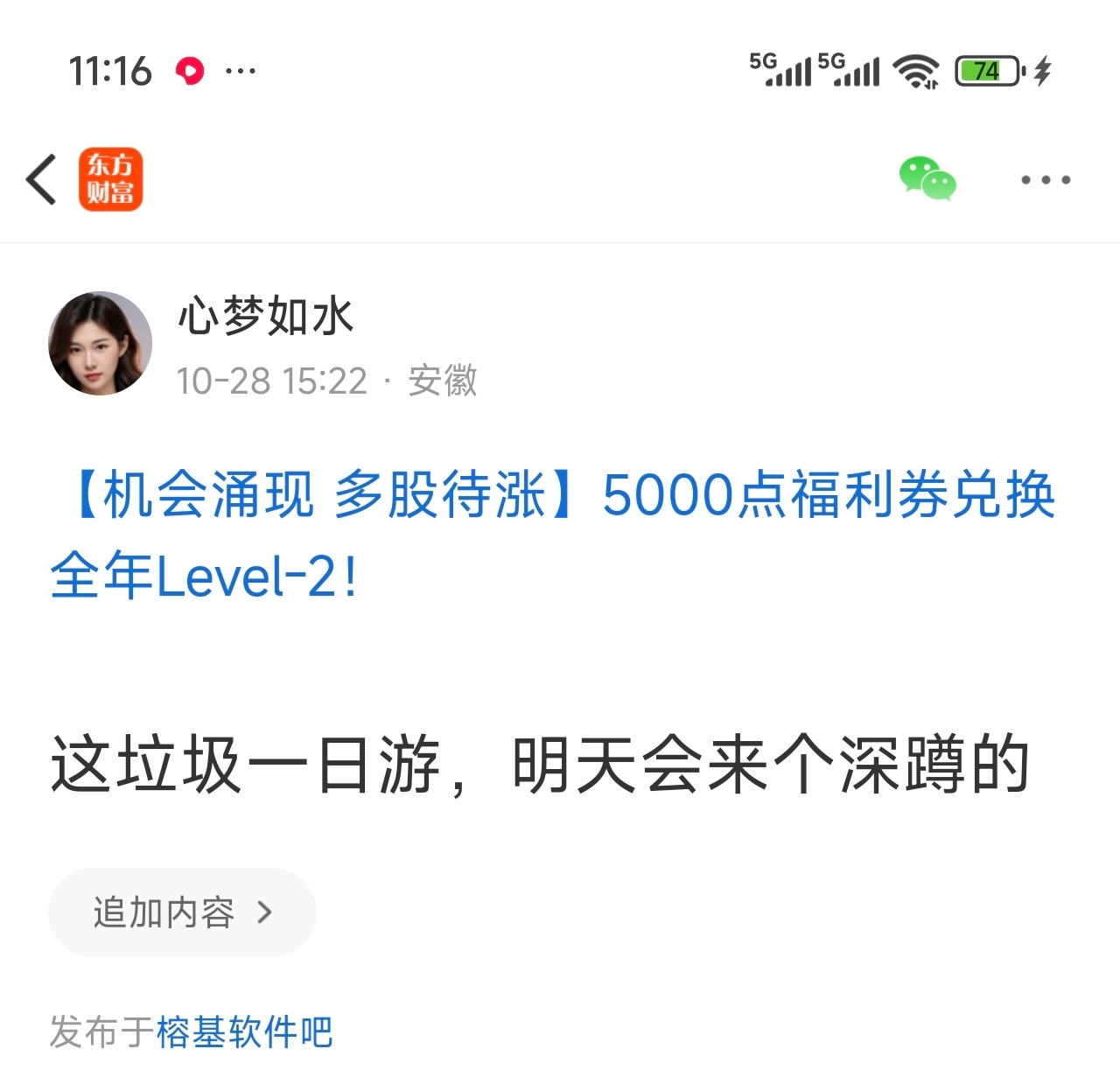 温馨提示: 1.根据《证券法》规定,禁止编造、传播虚假信息或者误导性信息,扰乱证券市场;2.用户在本社区发表的所有资料、言论等仅代表个人观点,与本网站立场无关,不对您构成任何投资建议。用户应基于自己的独立判断,自行决定证券投资并承担相应风险。《东方财富社区管理规定》