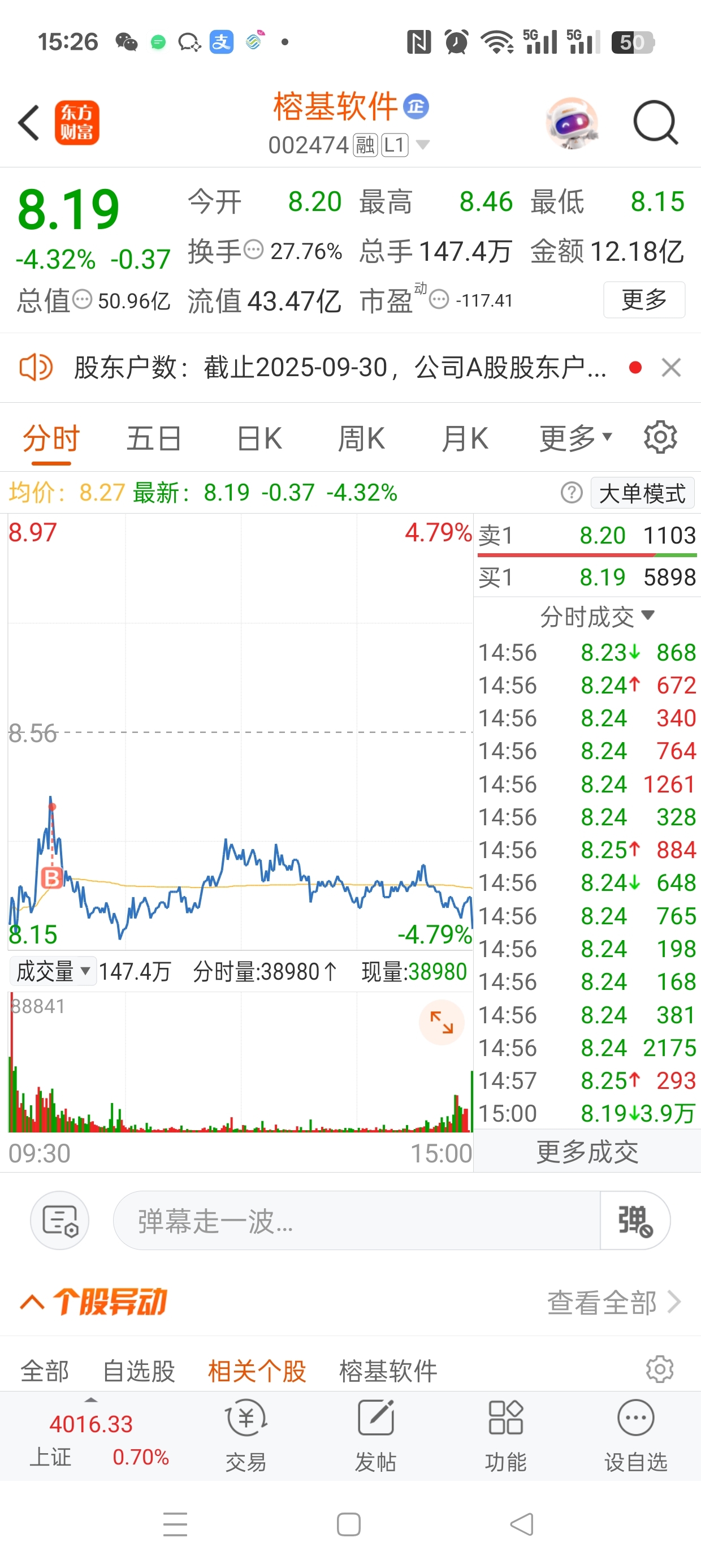 $榕基软件(SZ002474)$ 格尔软件涨停,然后追了你,没想到是日内高点,昨天涨停板买入的人都跑了吗?