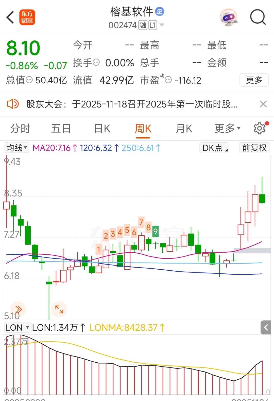$榕基软件(SZ002474)$ 11月第一周,榕基软件创了反弹新高,周k量能在35亿以上(启动量能10亿)。目前量,价都是温和,没有达到50亿周k的出货量能,只能重仓持有。不做操作。预计11月中下旬,会进去10元空间。耐心等待