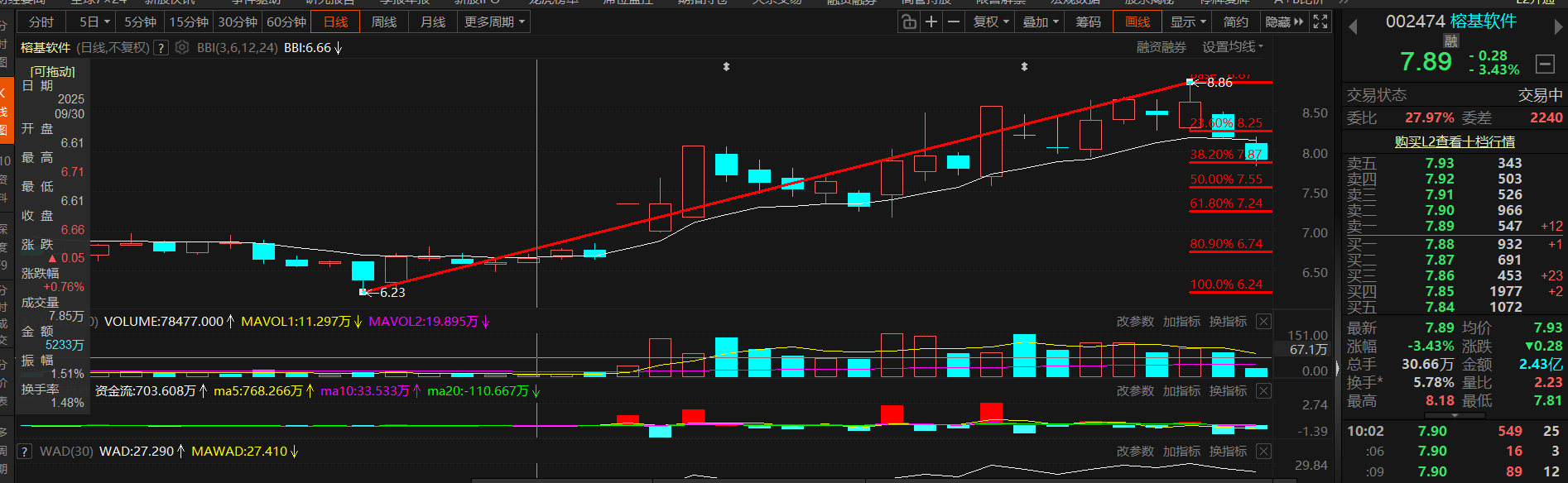 新日线前高8.86到前低6.23的黄金割线正好到7.87附近,加仓