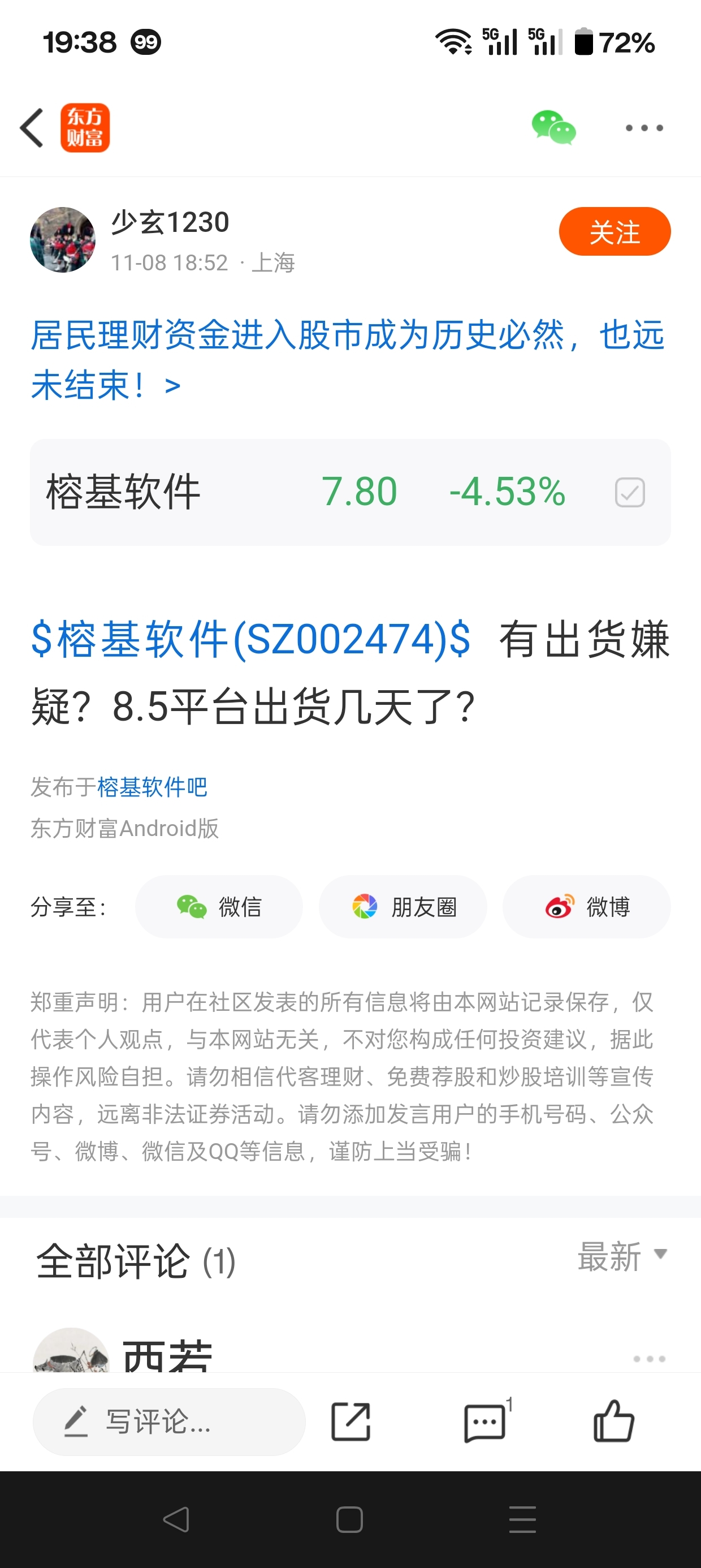 $榕基软件(SZ002474)$ 股吧有点幽默呢,看到好些人说庄家8.5平台出货了,好几天差不多出货完毕了。我就想问问你呢,如果你在8.50把榕基软件都卖光了。现在7.80,你会干嘛?继续打压股价?你都卖光了拿什么打压?庄家也是人,和你我都一样,卖出了股票总觉得股价会突然上涨,买了股票就感觉股价随时要跌。8.50出货了,现价7.80,你说庄家不买回来还能等什么呢?