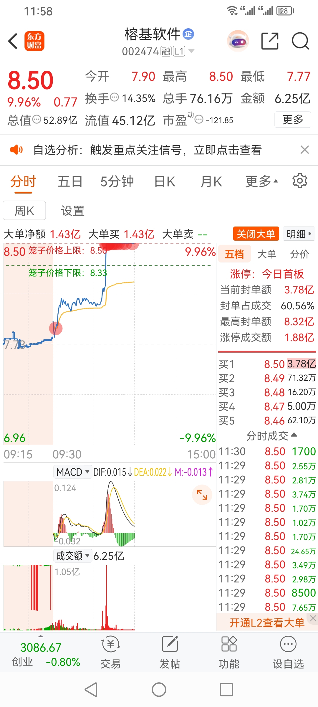 方军,今天操盘榕基软件,放量涨停板。看好,买进。2成仓位。