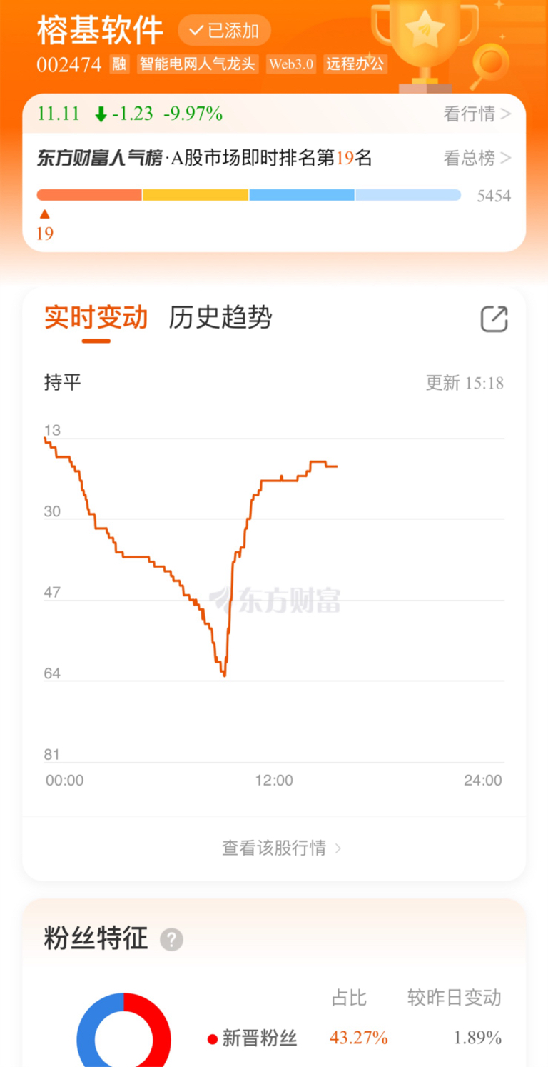 $榕基软件(SZ002474)$ 我一看这个人气走势我就知道今天进来的散户比昨天只多不少,从早上竞价制造弱转强假象,估计就骗了不少散户进来,后面上午一直开板,勾引外面的散户生怕错过一个地天。今天进的散户绝对比昨天多的多