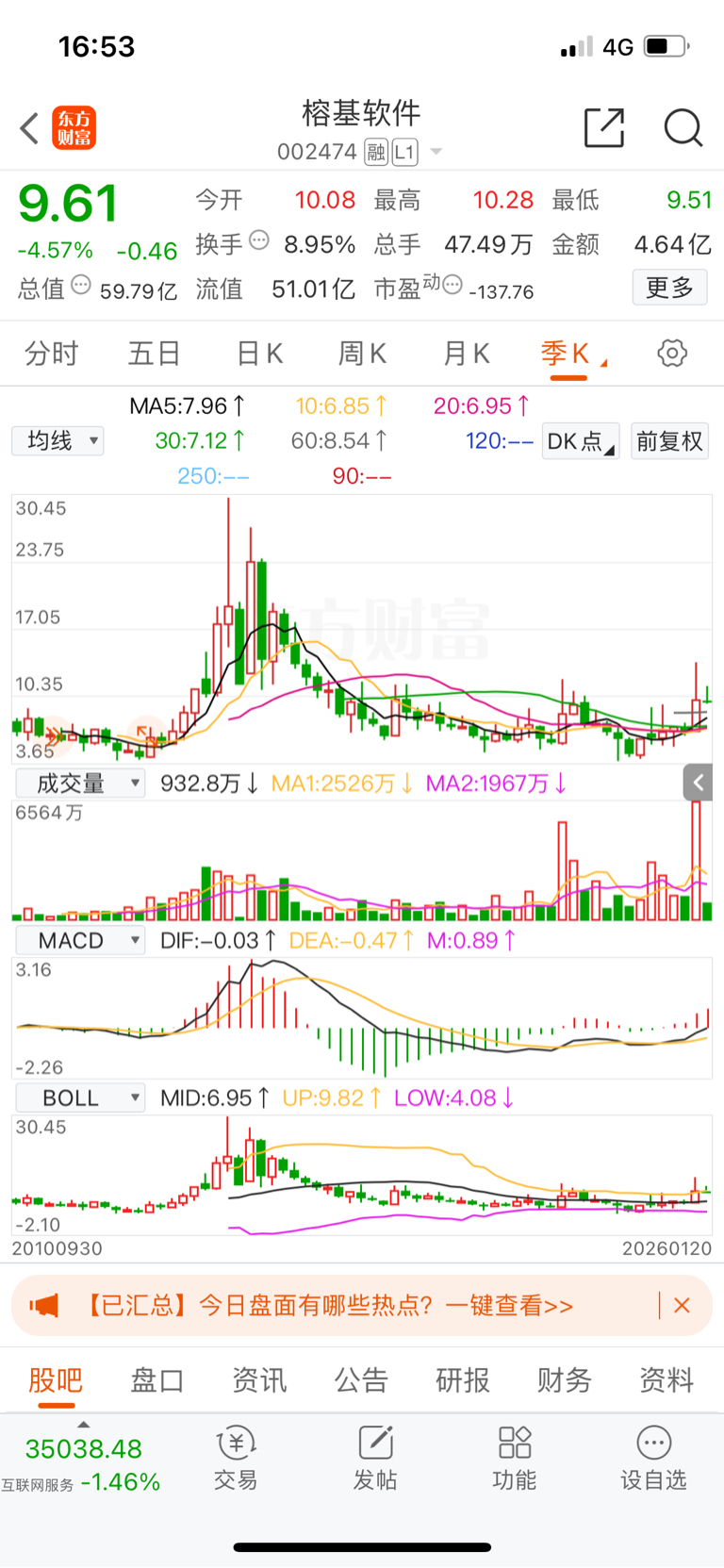 $榕基软件(SZ002474)$ 业绩遂年改善,市净率4.38估值偏低,又遇Ai元年,技术指标季线MACD底背离,横向盘整八年,今年有效突破八年平台,短期下跌空间有限(极限9元左右),中长期看好,一到两年有机会创历史新高30.45,立帖为证