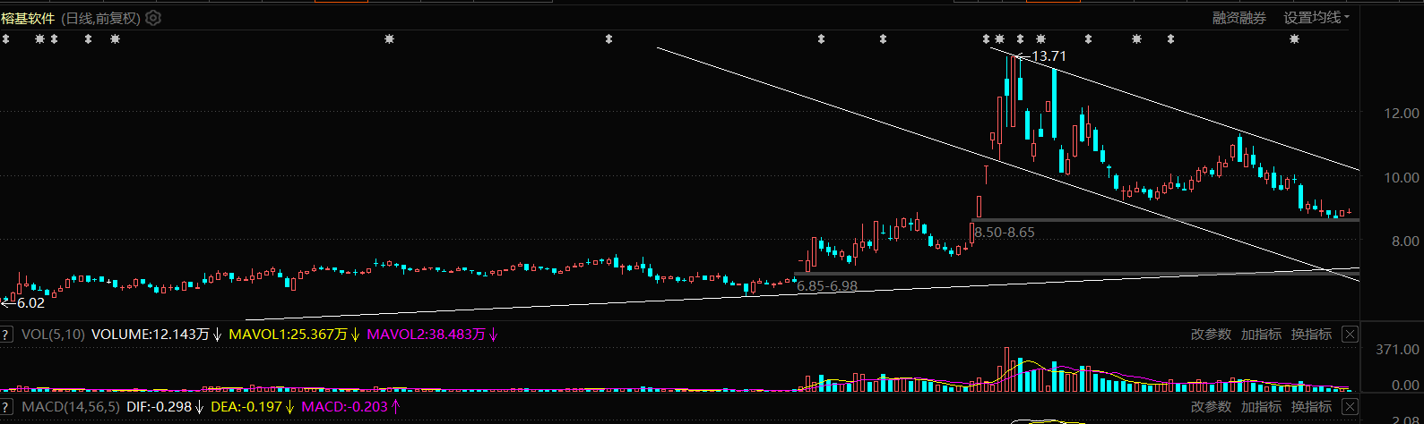 小散们继续站岗。此票下降趋势中,阴跌吸筹中,估价大概率要回踩上升趋势线。
