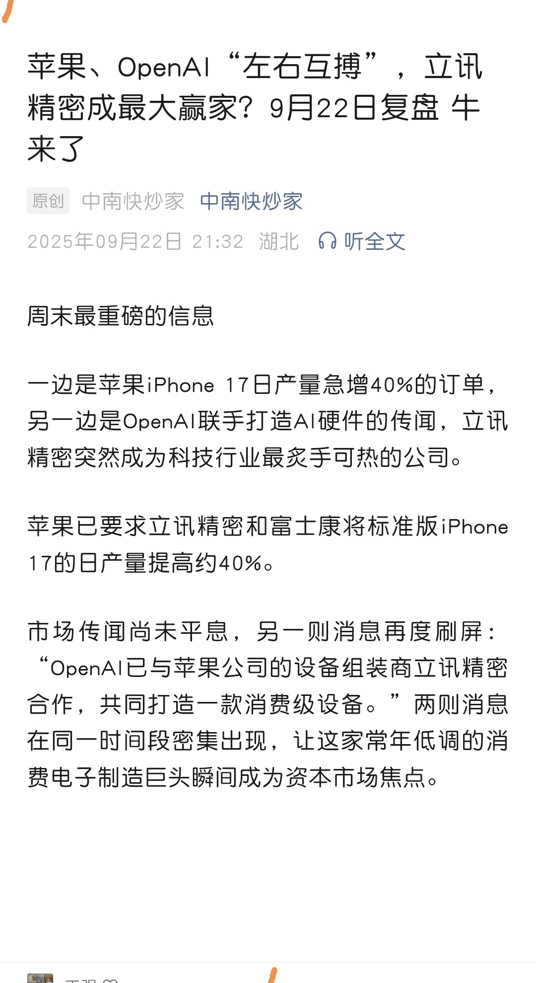 一边是苹果iPhone 17日产量急增40%的订单,另一边是OpenAI联手打造AI硬件的传闻,$立讯精密(SZ002475)$  突然成为科技行业最炙手可热的公司。苹果已要求立讯精密和富士康将标准版iPhone 17的日产量提高约40%。市场传闻尚未平息,另一则消息再度刷屏:“OpenAI已与苹果公司的设备组装商立讯精密合作,共同打造一款消费级设备。”两则消息在同一时间段密集出现,让这家常年低调的消费电子制造巨头瞬间成为资本市场焦点。