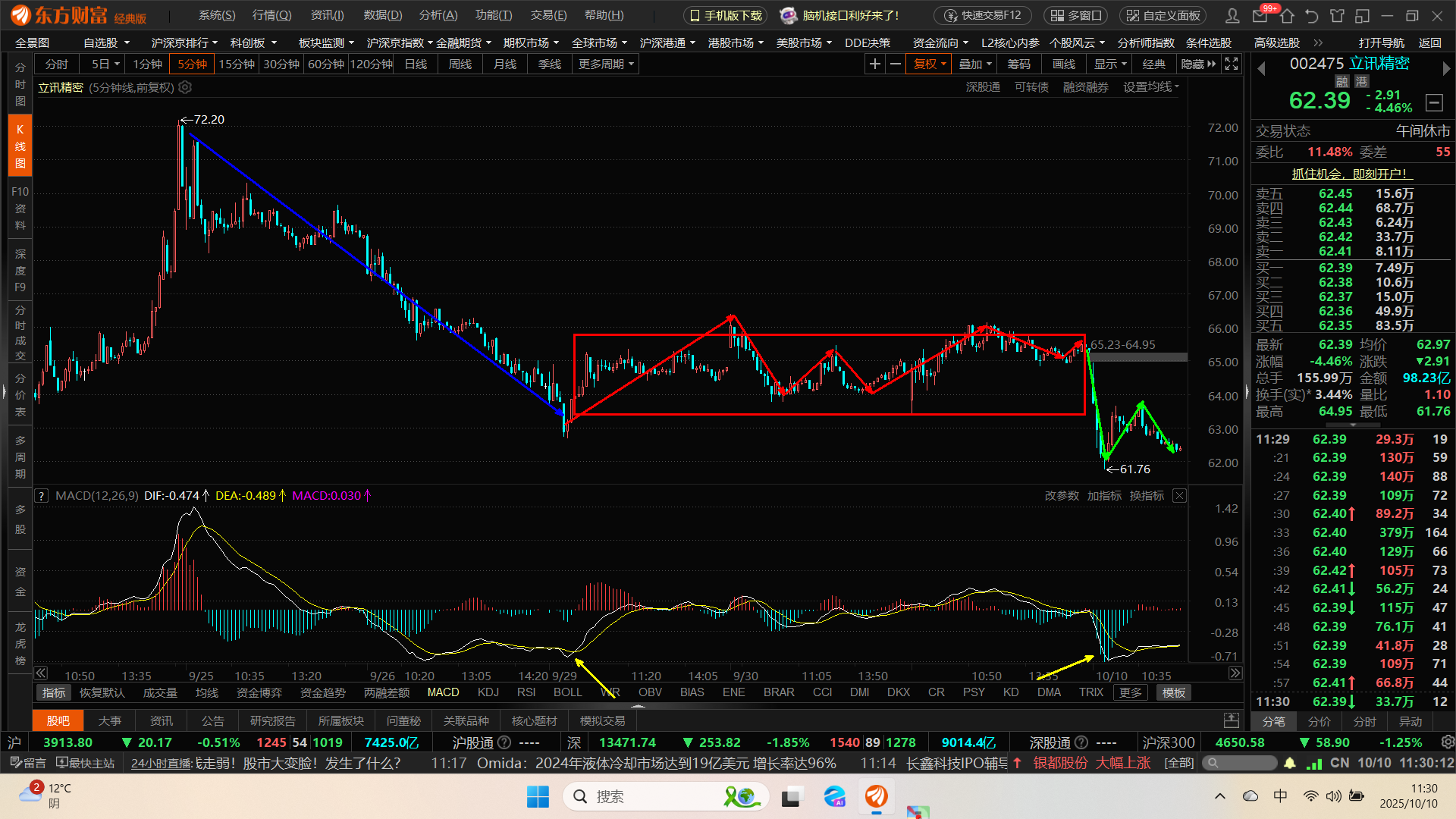 今早的下杀力度比72下来的一段还要大,64附近的箱体有效破掉后今早的回拉没有力度,是最后的逃命机会,也就是俗称的3卖。 套住的忍忍吧,没有背驰。