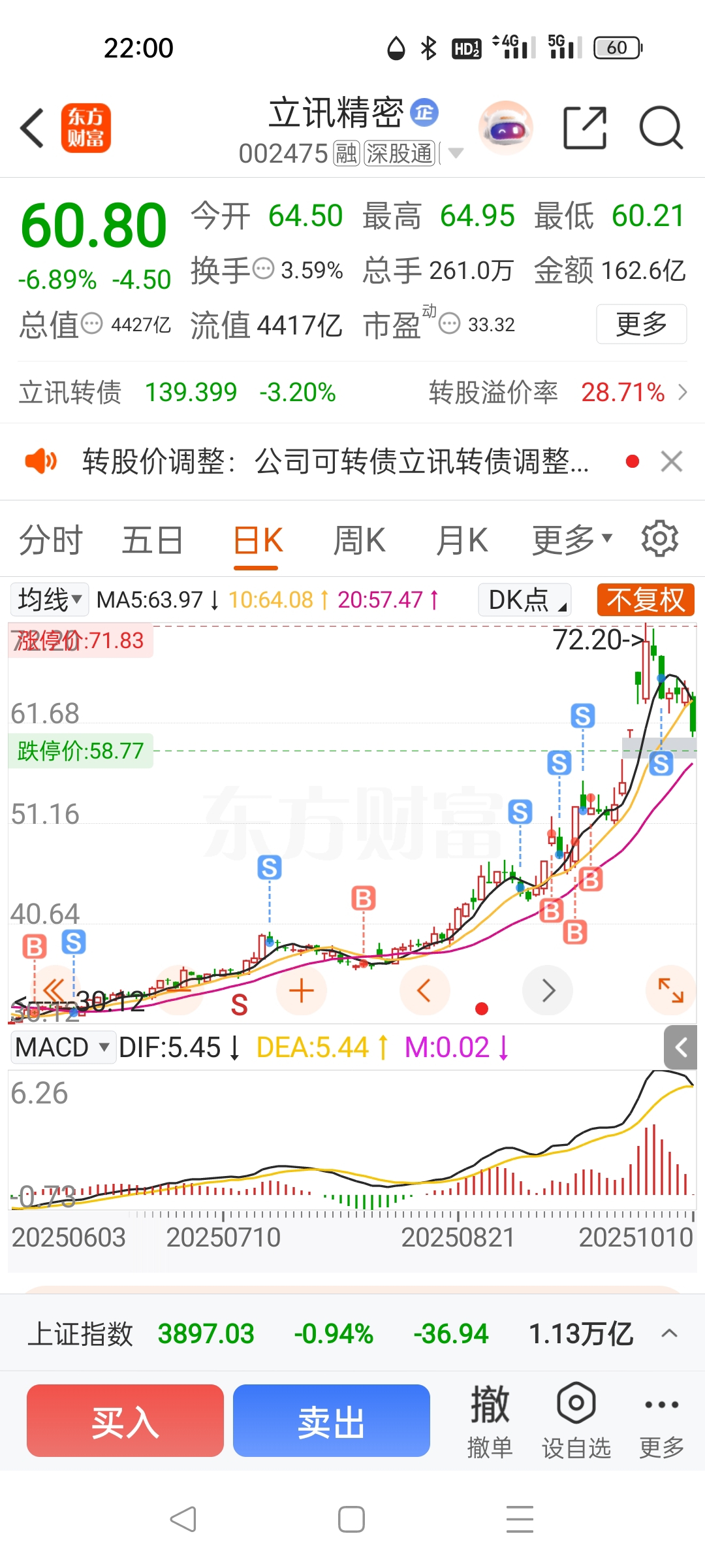 $立讯精密(SZ002475)$ 还好跌破5日线时卖了半仓去矿业ETF,挣了十几个点,半仓去了豪威,亏的一塌糊涂割了,等到20日线56左右再考虑买回立讯吧!
