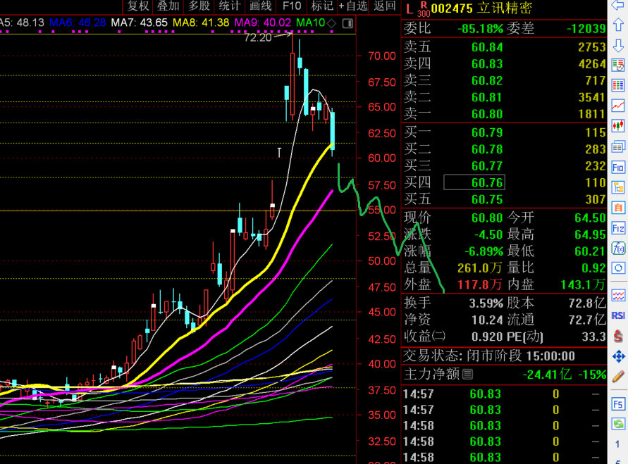 下周一大概率低开百分之六收盘跌停板,可以参考四月七号,果链板块个股大都是连续两个