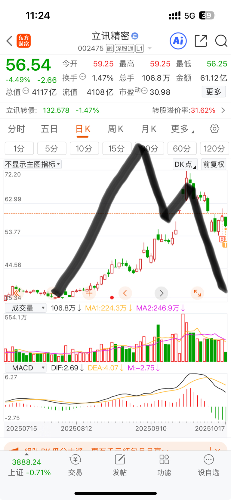 $立讯精密(SZ002475)$ 被套死,做反t,也认了,星期一直接割,已经是高位了,已经是千亿市值了,