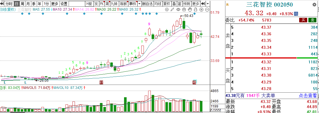 公司是从家电企业成功转型为新能源汽车核心零部件供应商企业,是全球最大制冷控制器和汽车空调和热管理系统供应商。客户覆盖了,特斯拉,比亚迪,大众,丰田等国内外大部分的头部企业。近几年业绩都是保持稳定两位数增长,毛利率维持在20%以上,也保障了股价一直都出不断上涨。最近最大看点就是公司拟将回购股份从35元大幅提高到60元,而目前股价才43,将大幅提振短期股价异动。最近股价大幅异动,机构和一线柚子逆势流入,也提振短期股价继续上涨。技术上,目前是上涨趋势中的震荡回落,上涨趋势并没有变。周五在五日线附近逆势走强,说明这个位置已经企稳。早盘集合竞价若能明显高开,短线将结束震荡再创新高。策略是在水上研究,如果是水下震荡还有观望。