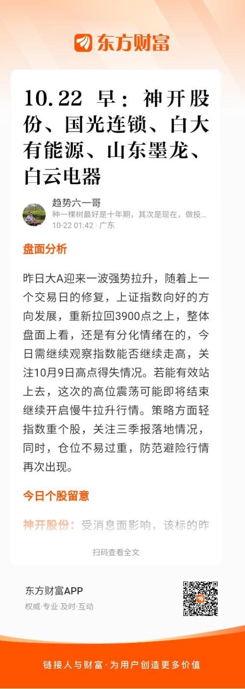 昨日大A迎来一波强势拉升,随着上一个交易日的修复,上证指数向好的方向发展,重新拉回3900点之上,整体盘面上看,还是有分化情绪在的,今日需继续观察指数能否继续走高,关注10月9日高点得失情况。若能有效站上去,这次的高位震荡可能即将结束继续开启慢牛拉升行情。策略方面轻指数重个股,关注三季报落地情况,同时,仓位不易过重,防范避险行情再次出现。