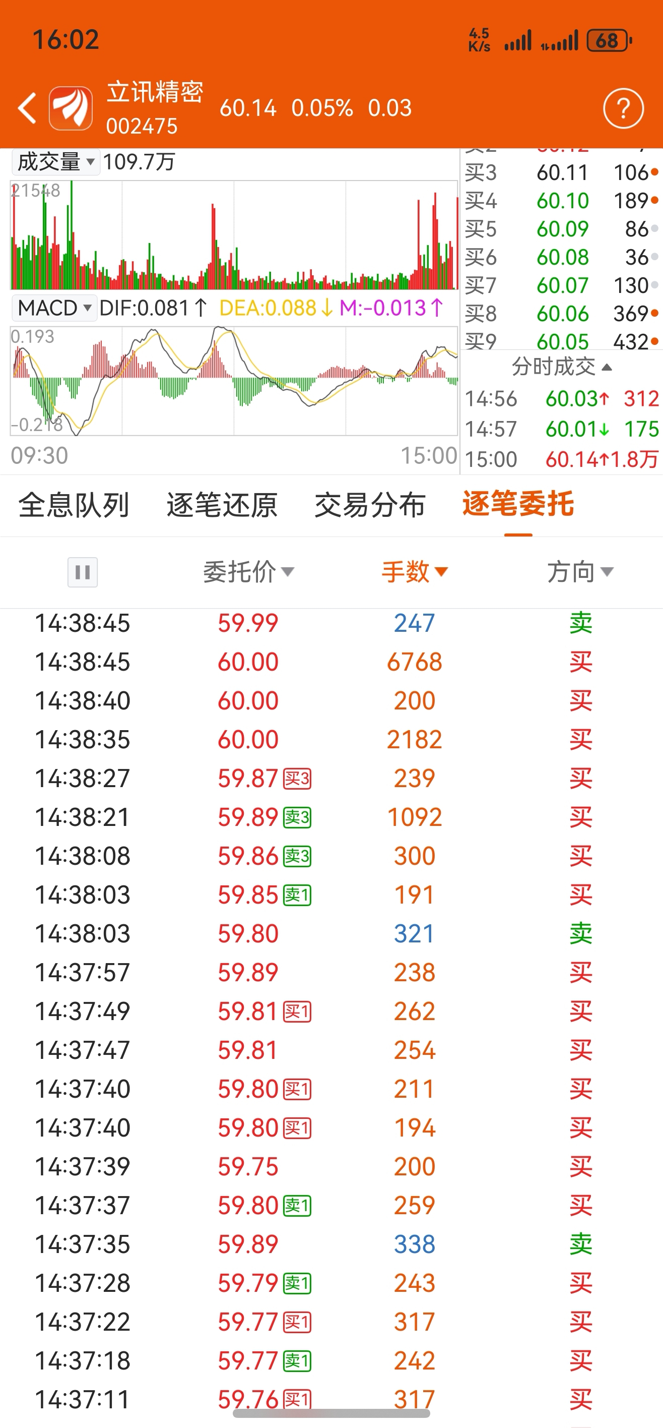 $立讯精密(SZ002475)$ 有大佬拿筹码啊,都是在60.00