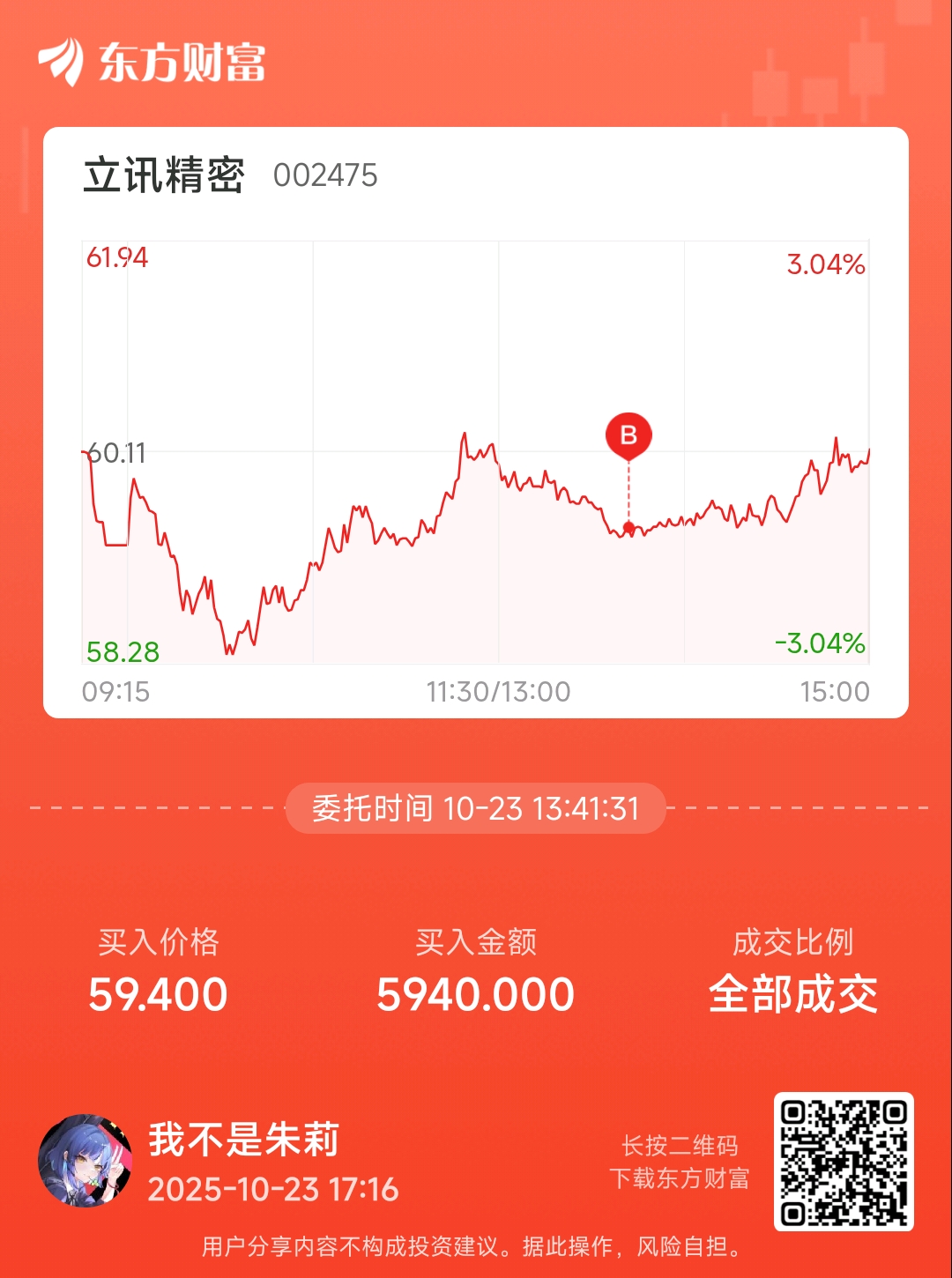 $立讯精密(SZ002475)$ 下午买了100,单位不告诉你们,买完不小心止跌了