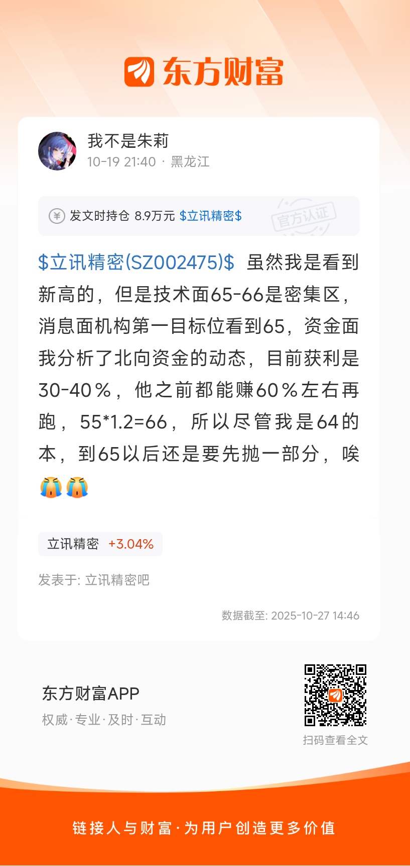 $立讯精密(SZ002475)$ 虽然我是看到新高的,但是技术面65-66是密集区,消息面机构第一目标位看到65,资金面我分析了北向资金的动态,目前获利是30-40%,他之前都能赚60%左右再跑,55*1.2=66,所以尽管我是64的本,到65以后还是要先抛一部分,唉