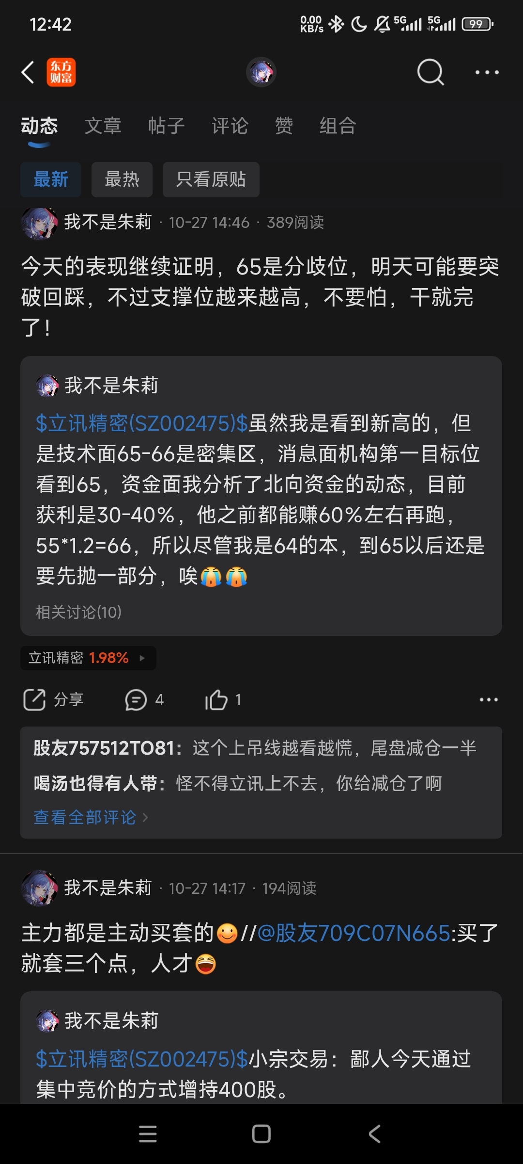 $立讯精密(SZ002475)$ 第一分歧位干过去了,下午守稳65就行,第二分歧位69,目前股价一直按我分析的走,当初看到40的也不知道你什么逻辑