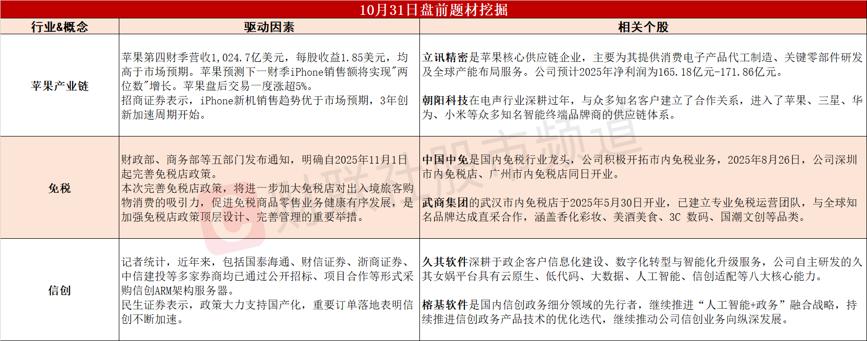 ①下季度iPhone销售额将"两位数"增长,苹果供应链龙头有望同步受益。②五部门完善免税店政策,有望为行业带来销售增量。③重要订单落地,机构称信创产业有望持续加速发展。