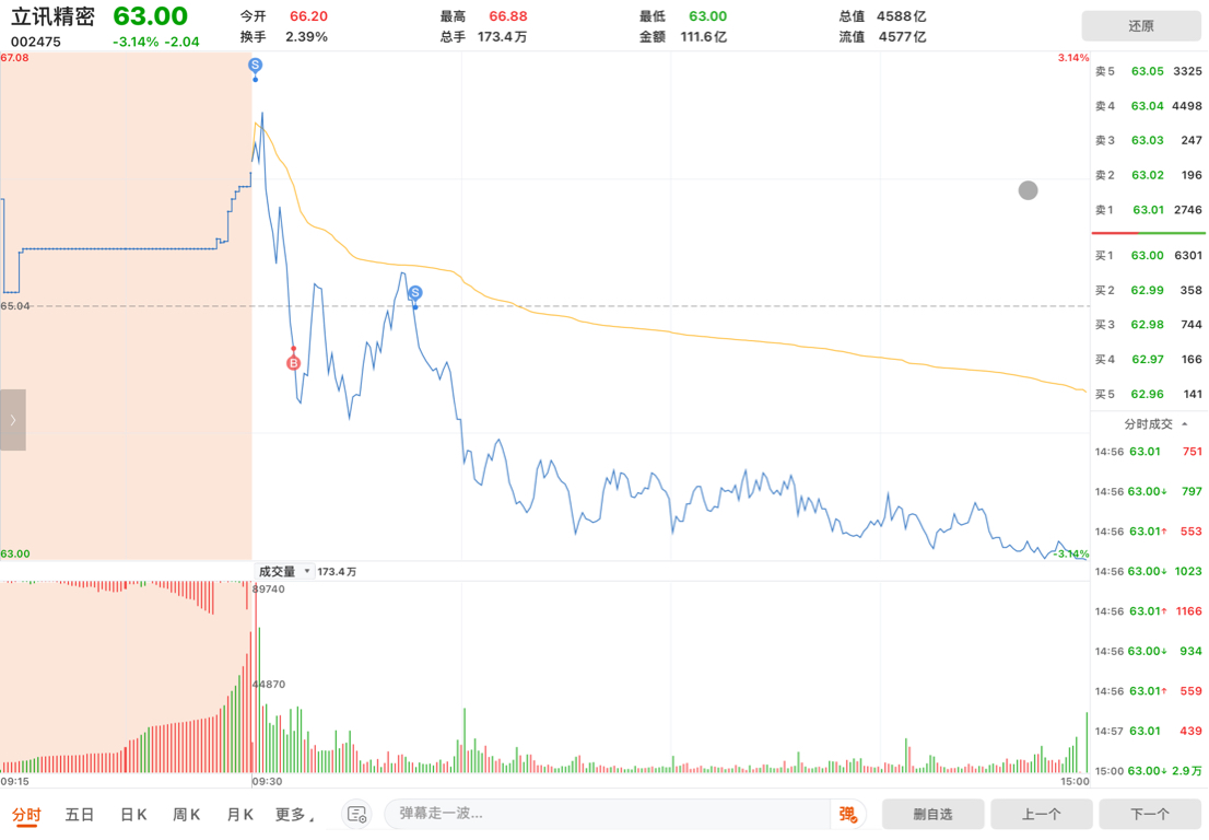 $立讯精密(SZ002475)$ 这几乎完全复制了昨天富联的走势,不过比鹏鼎单日走的要强多了,最起码早盘有爬高(这大概也是对业绩的回应吧)