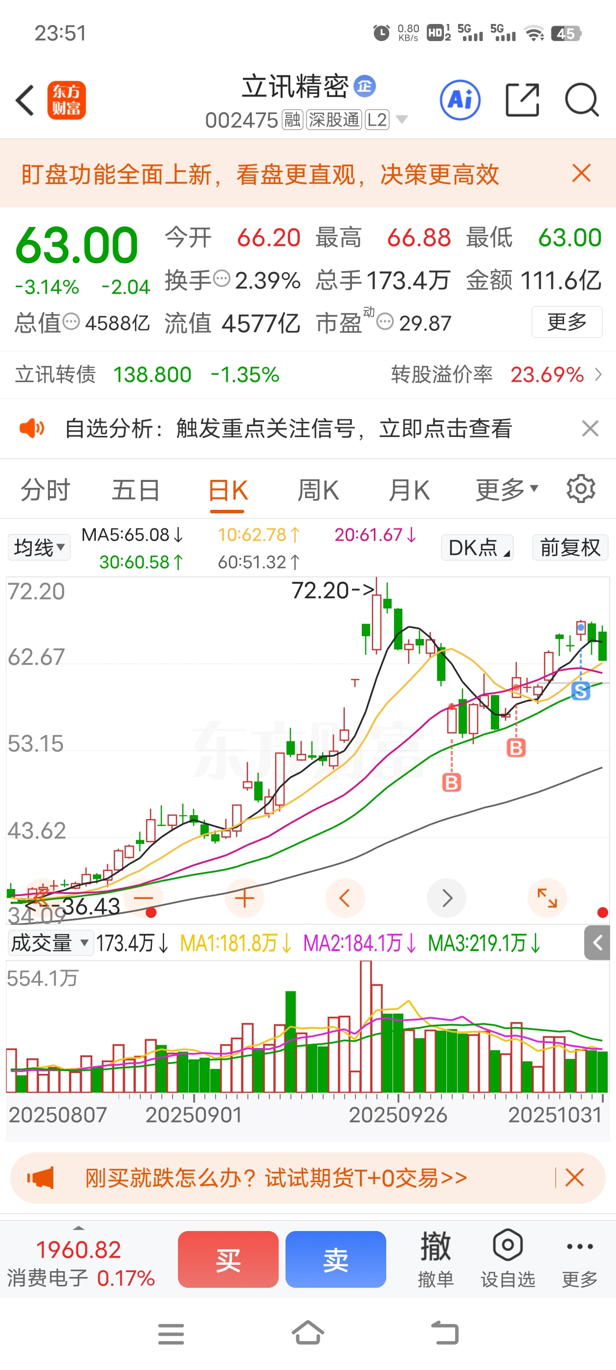 $立讯精密(SZ002475)$ 短期内应该是机构量化资金获利盘的出逃,31号的k线图也是出货标志。再调整一波,58左右再考虑入手,长期看好,目标100。