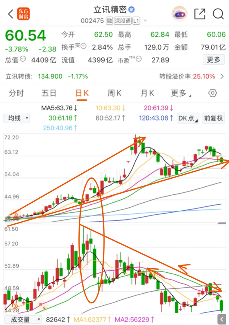 回调一点就开始bb了,立讯是健康回调;还在上涨趋势中;给你们看看这个精研才是跌,
