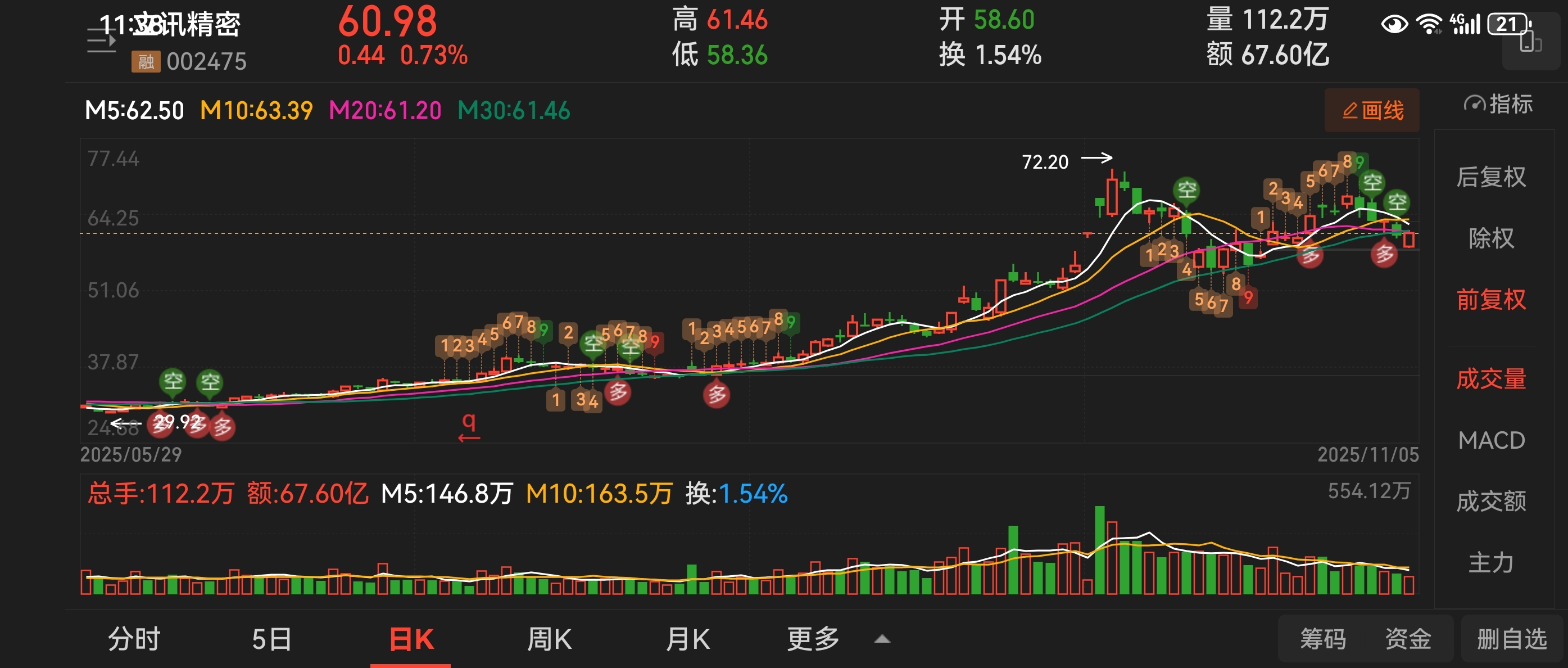 $立讯精密(SZ002475)$ 立讯这轮也调整差不多了,下探支撑位,下午盘拉回三十日线附近,股价有反弹需求!看
