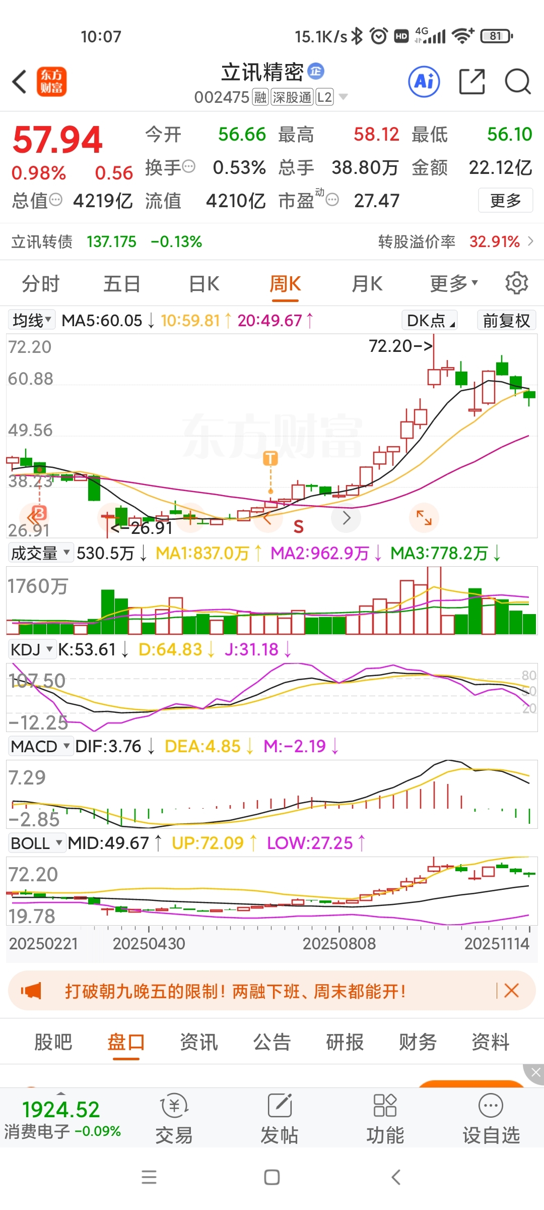 $立讯精密(SZ002475)$ 周线三连阴跌,本周是无望收阳了。把希望留给下一个星期了。立讯啊,怒其不争,哀其不幸。
