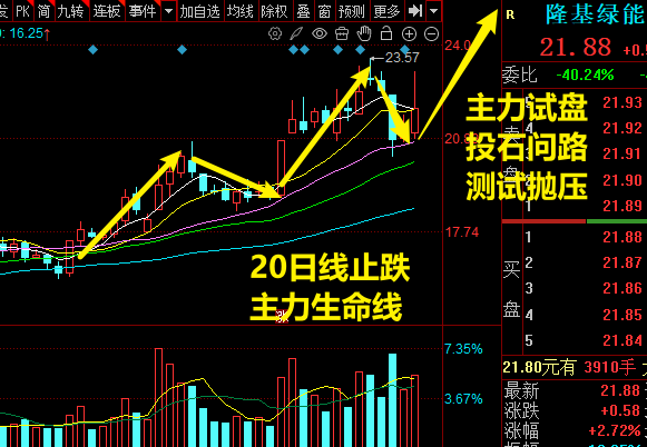 股价走上升趋势,高点在不断抬升,低点在不断上移,20日均线作为主俚的生命线,每次回踩支撑后,主俚护盘意图非常明显,周五放量收出长上影线,主俚在试盘,前期张停的位置是主俚的第一次试盘线,周五这里是主俚二次试盘,这个位置接下来主俚会向下洗盘,再次回踩20日均线,则是完美的上车讯号。