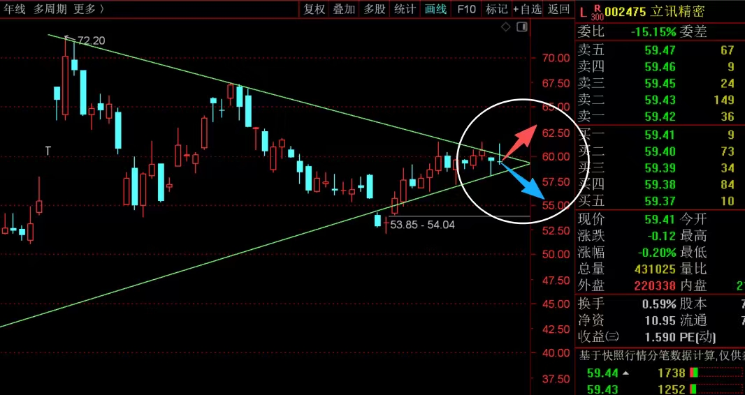 $立讯精密(SZ002475)$ 近期主要是看一个大的三连收敛形态完成后的方向选择,也就是这几天的事儿,能带量突破站稳,那这一波回调基本就完成了,起码能看个反弹周期,但如果起不来,跌破脚底趋势线,那就要防着破位风险了,需要严格控制仓位应对,不用纠结,等回调走稳了再考虑不迟。#复盘记录# #炒股日记#