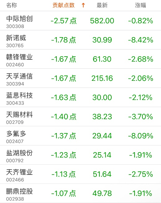 对深证成指贡献点数最多的个股是立讯精密,贡献7.8点,该股当日涨3.66%,收盘价60.38元;拖累点数最多的个股是中际旭创,拖累2.57点,该股当日跌0.82%,收盘价582元。