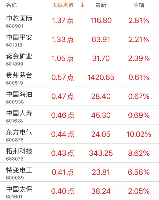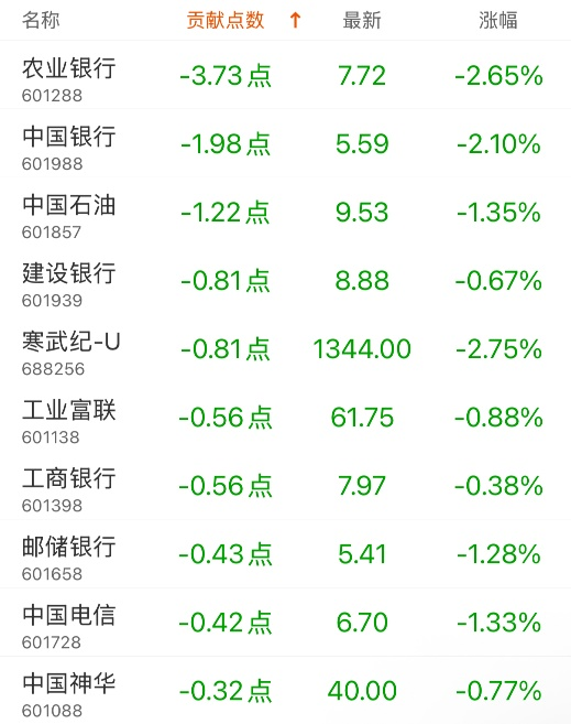 对上证指数贡献点数最多的个股是中芯国际,贡献1.37点,该股当日涨2.81%,收盘价116.8元;拖累点数最多的个股是农业银行,拖累3.73点,该股当日跌2.65%,收盘价7.72元。