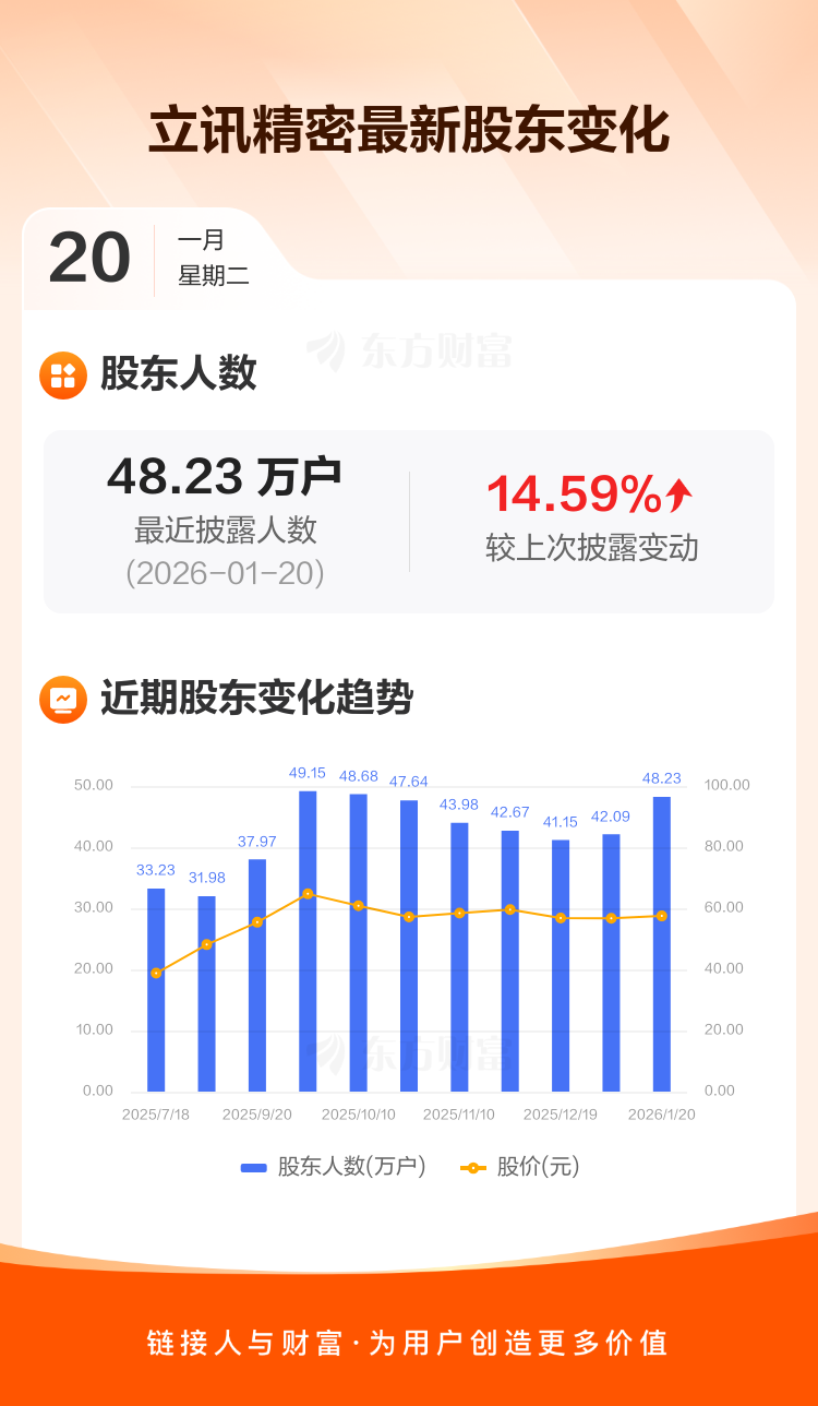 立讯精密最新披露数据显示,截至1月20日公司股东户数为48.23万户,较上期(2025年12月31日)增加6.14万户,增幅为14.59%。户均持有流通股数量由上期的1.73万股下降至1.51万股,户均持股金额由上期的97.94万元减少至86.59万元。