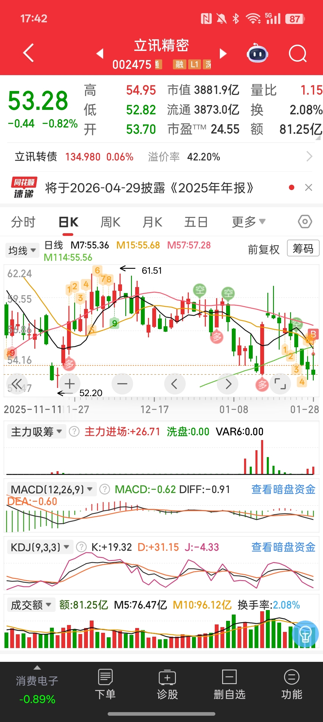 $立讯精密(SZ002475)$ 今天刚来,明天看看有没有好运