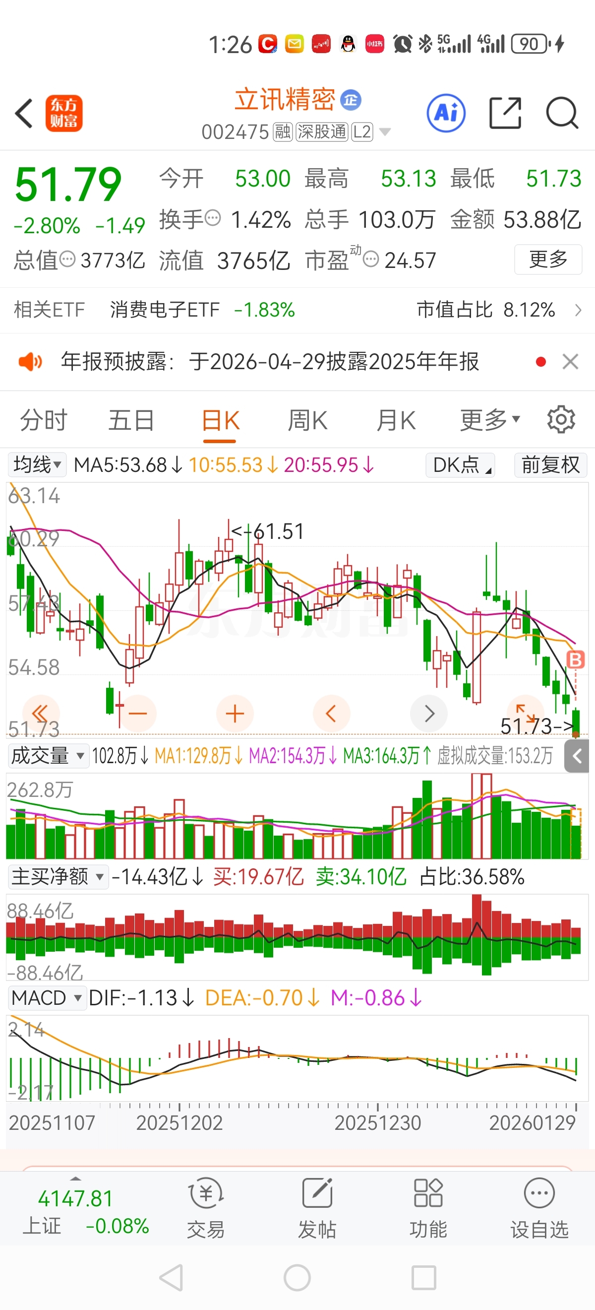 $立讯精密(SZ002475)$ 十连阴,害怕