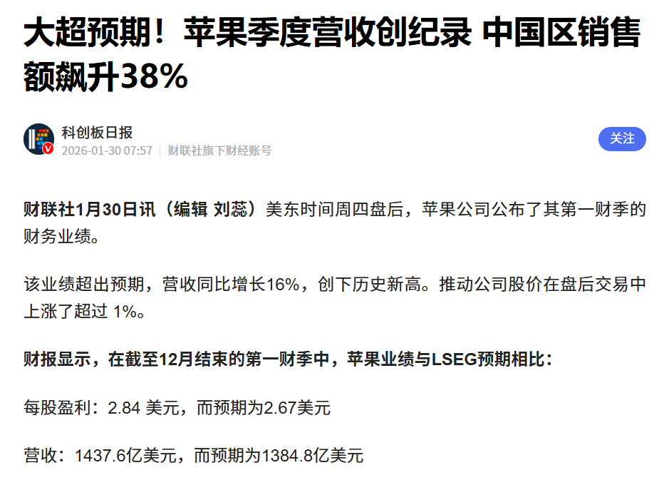 苹果逆势上涨:苹果季度营收创纪录, 中国区销售飙升38%,38%是一个很高的增长。