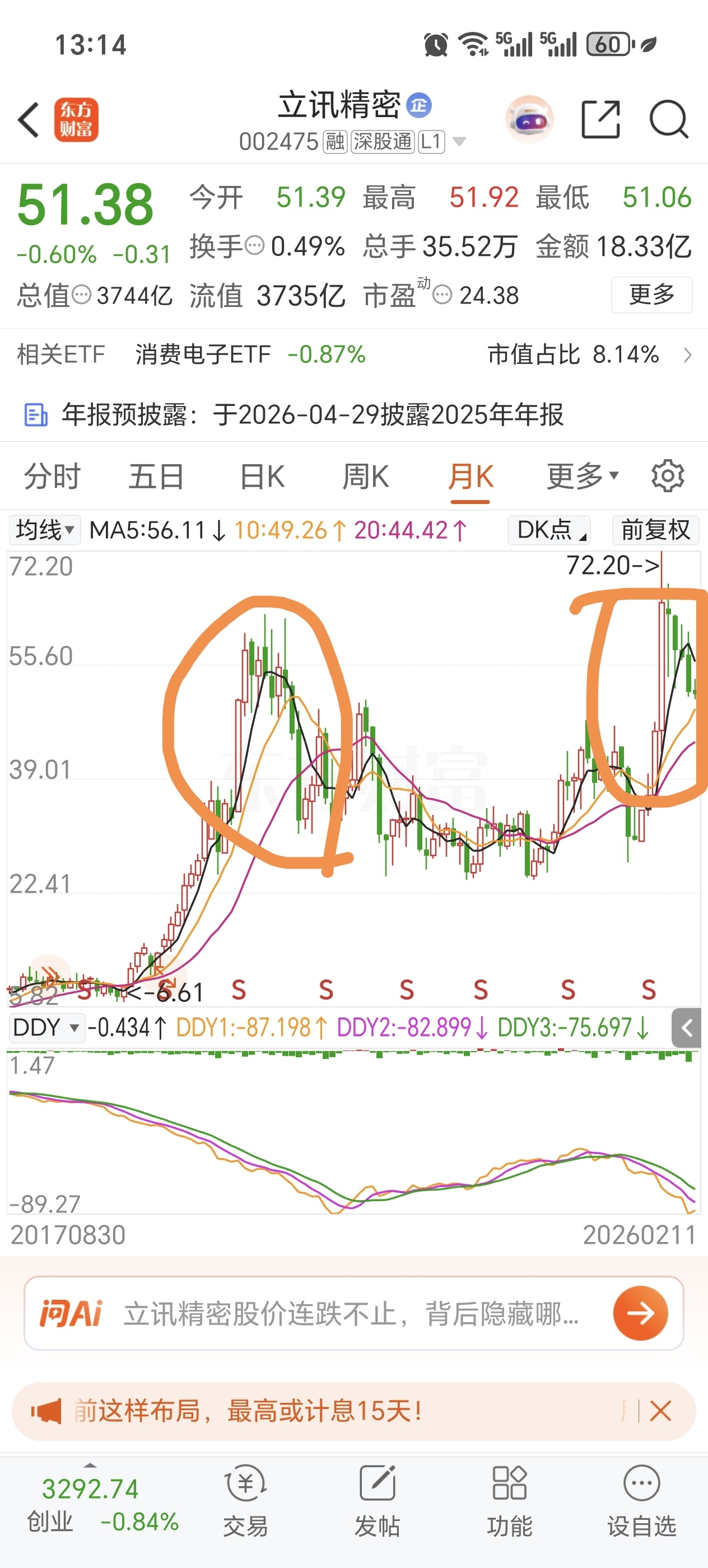 $立讯精密(SZ002475)$ 看过去,最高点63跌到32,这次最高点71,最少要跌到41吧