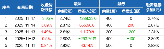 宝莫股份融资融券信息显示,2025年11月17日融资净偿还1288.33万元;融资余额2.74亿元,较前一日下降4.48%