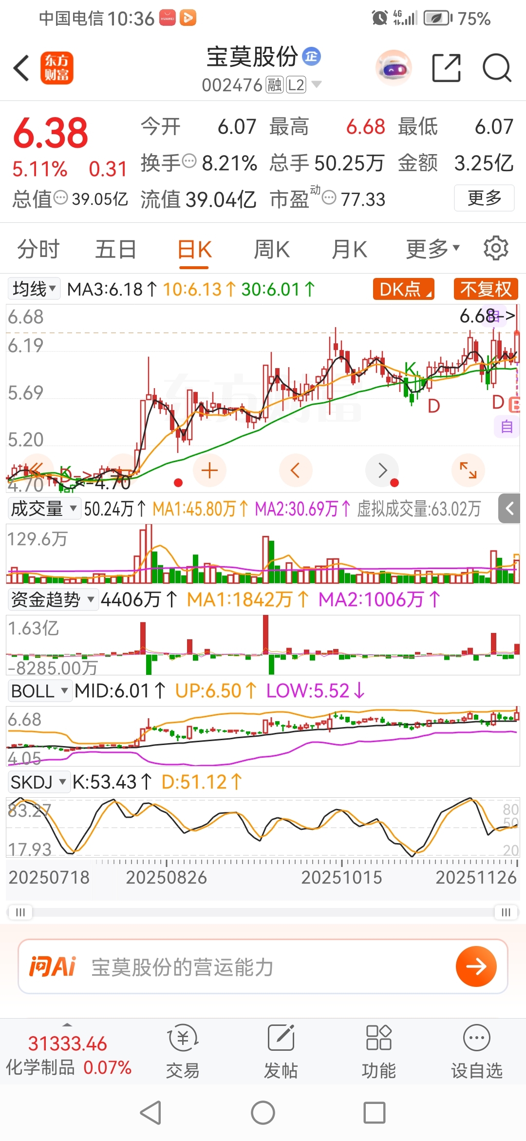 $宝莫股份(SZ002476)$ 今天买的不涨,手气一般。#炒股日记#