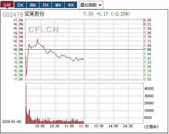 二级市场上,从分时图看,宝莫股份8日开盘后资金有分歧,跌超5%后一度有拉升,但此后整体震荡走低,截至午间收盘跌2.25%。