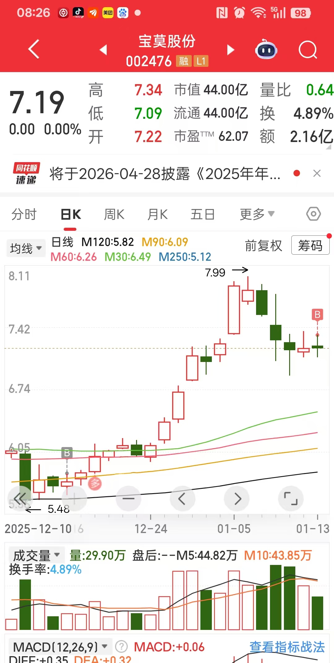 $宝莫股份(SZ002476)$ 友情提示,宝莫目前横盘,小路加了点仓位,巳有盈利的朋友,要去要留请自行决定。大家都很忙,不再提醒。