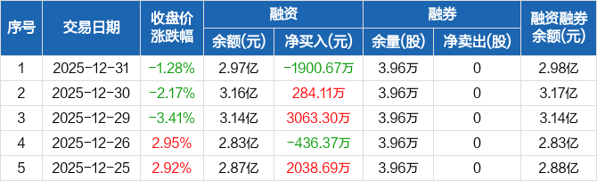 常宝股份:融资净偿还1900.67万元,融资余额2.97亿元(12-31)