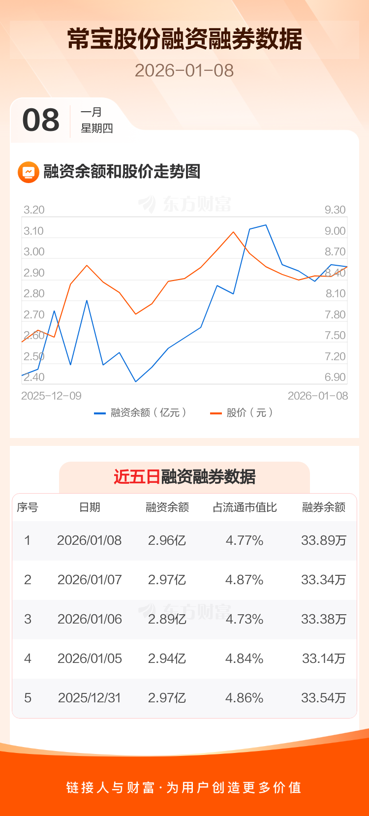 交易所最新数据显示,常宝股份于2026年1月8日获融资买入2922.60万元,融资偿还3072.79万元,当日融资净偿还150.19万元。目前,该股融资余额2.96亿,占流通市值比例为4.77%。