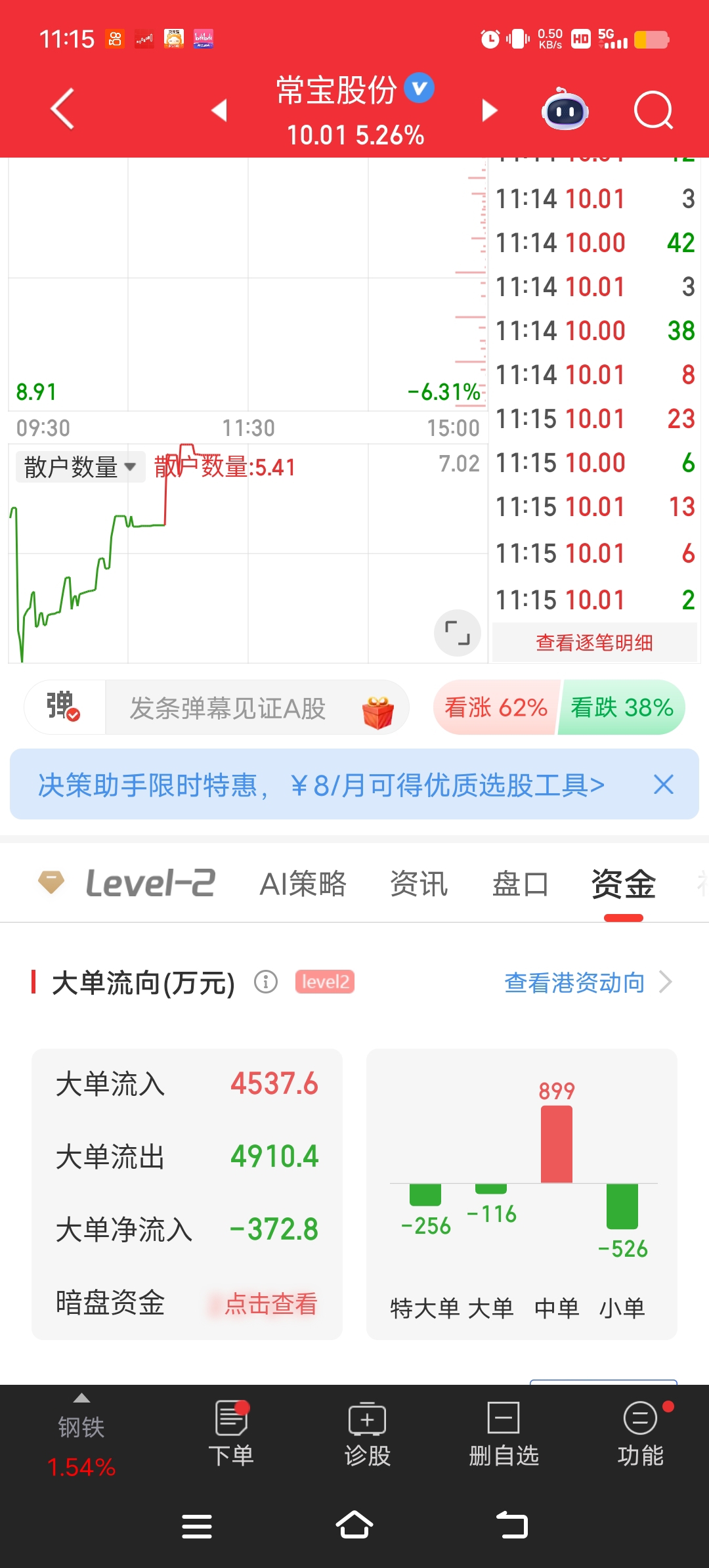 $常宝股份(SZ002478)$ 主力资金由早盘流入变流出,散户数量由流出变流入,常宝最近以震荡为主,把握好节奏才能赚钱,长线持有和追高的基本都亏钱!!!