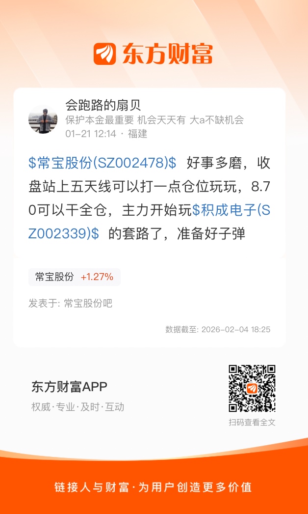 $常宝股份(SZ002478)$ 好事多磨,收盘站上五天线可以打一点仓位玩玩,8.70可以干全仓,主力开始玩$积成电子(SZ002339)$ 的套路了,准备好子弹